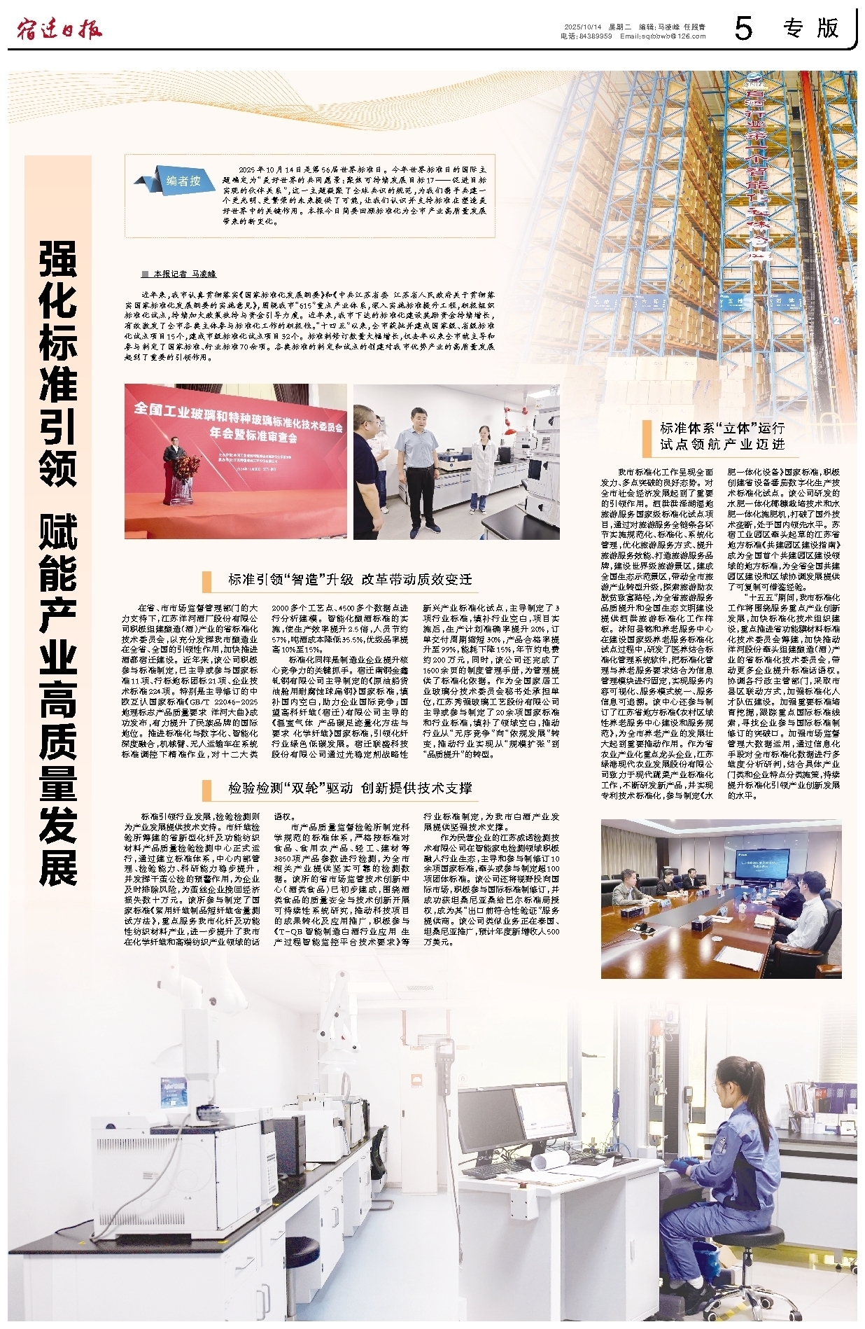 标准化同样是制造业企业提升核心竞争力的关键抓手。宿迁南钢金鑫轧钢有限公司主导制定的《原油船货油舱用耐腐蚀球扁钢》国家标准,填补国内空白,助力企业国际竞争;国望高科纤维(宿迁)有限公司主导的《温室气体 产品碳足迹量化方法与要求 化学纤维》国家标准,引领化纤行业绿色低碳发展。宿迁联盛科技股份有限公司通过光稳定剂战略性新兴产业标准化试点,主导制定了3项行业标准,填补行业空白,项目实施后,生产计划准确率提升20%,订单交付周期缩短30%,产品合格率提升至99%,能耗下降15%,年节约电费约200万元,同时,该公司还完成了1600余页的制度管理手册,为管理提供了标准化依据。作为全国家居工业玻璃分技术委员会秘书处承担单位,江苏秀强玻璃工艺股份有限公司主导或参与制定了20余项国家标准和行业标准,填补了领域空白,推动行业从“无序竞争”向“依规发展”转变,推动行业实现从“规模扩张”到“品质提升”的转型。