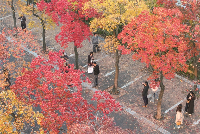 11月4日,市湖滨新区一处生态停车场上的乌桕树色彩斑斓,美不胜收,吸引众多游客前来打卡拍照。