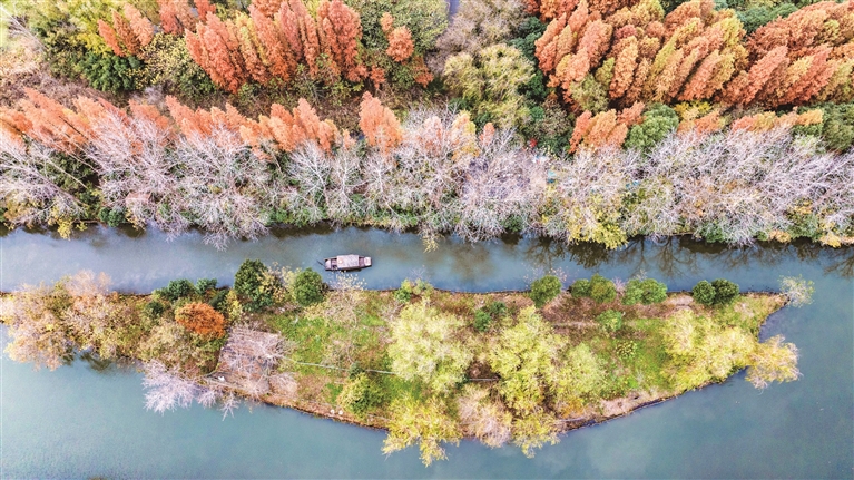 12月2日,游客在江苏省泰州市姜堰区溱湖国家湿地公园赏景游玩(无人机照片)。